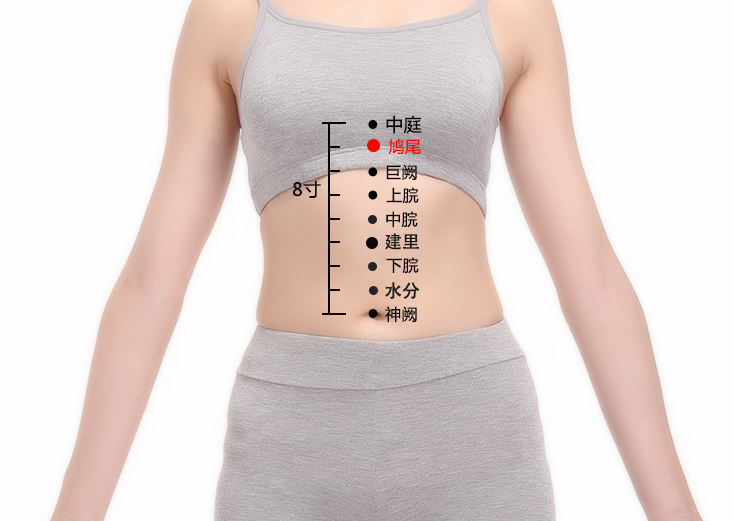 鸠尾穴配梁门穴、足三里穴治胃痛;